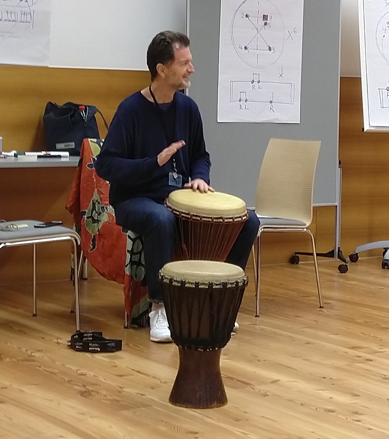 Wir sitzen im Kreis und haben afrikanische Djemben vor uns, die mit warm klingendem Kuhfell bespannt sind. Das Kuhfell erzeugt im Gegensatz zur klassischen Ziegenfell-Bespannung einen warmen, angenehmen Ton.
