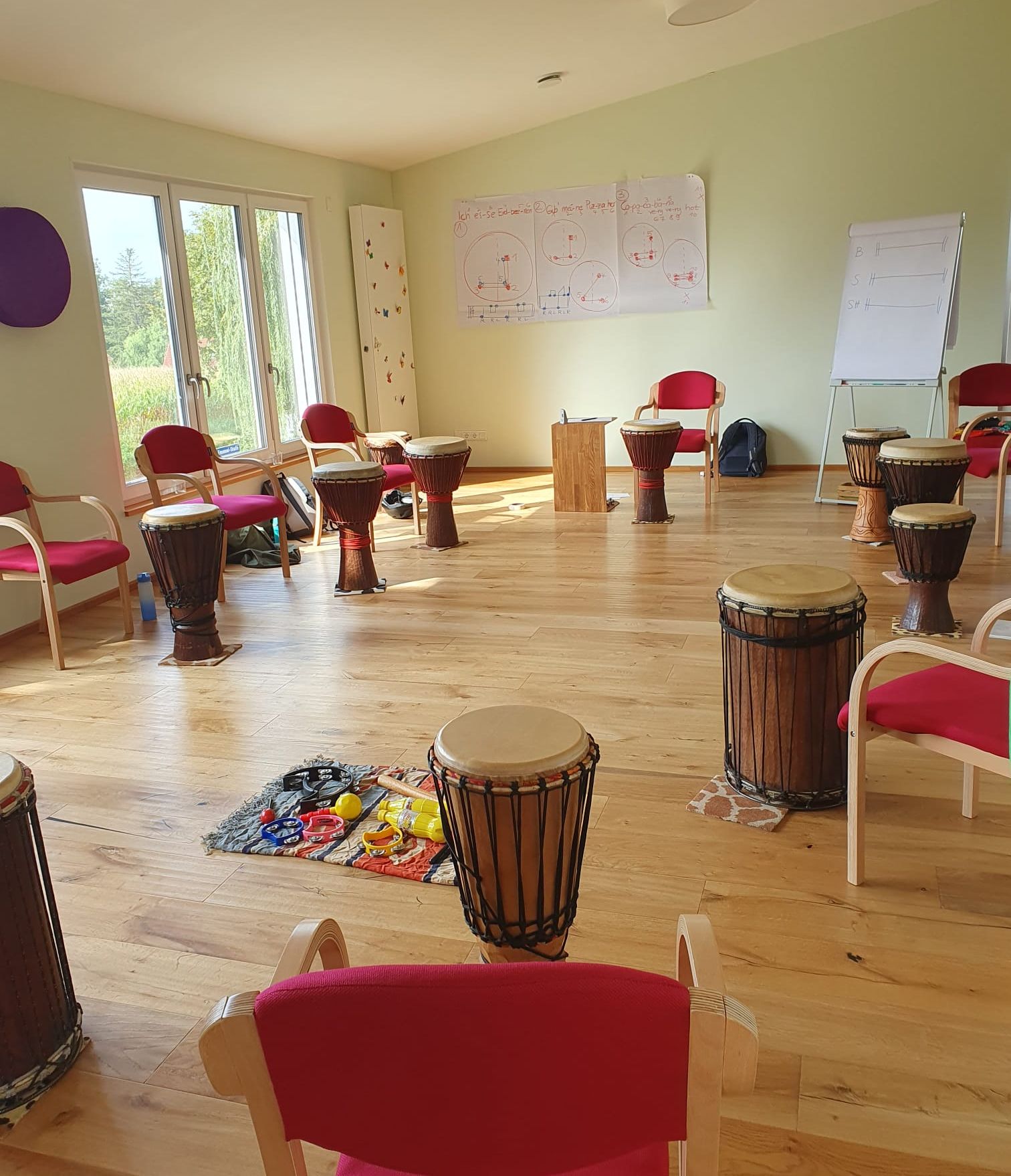 Der helle Workshop-Raum lädt zum Trommeln ein